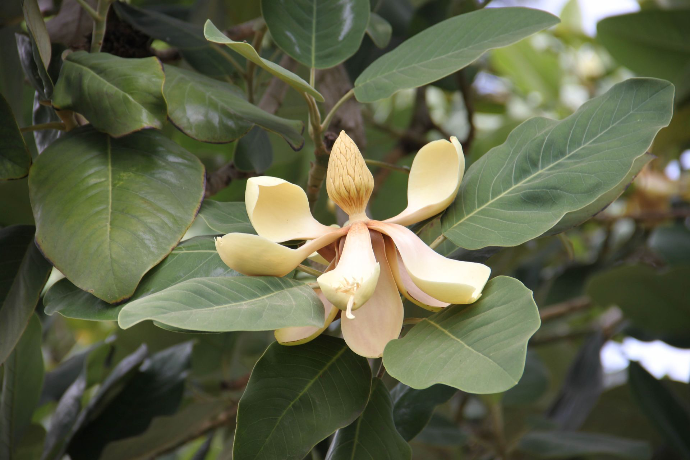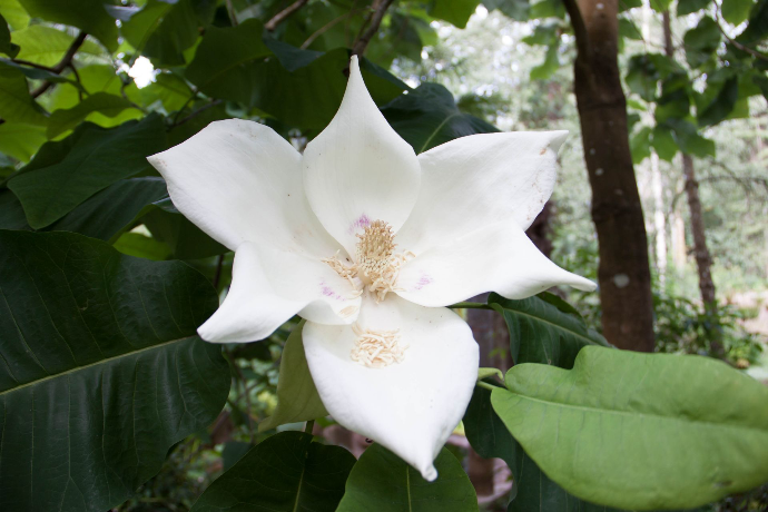 Snakebark maples include several species from Asia and North America. Ours is Acer tegmentosum from China (Bed 24) and its chalky, white-striped bark has ghostly appeal throughout the winter. Our plant is of the cultivar ‘Joe Witt’, named by Dan Hinkley for the former curator of the Arboretum in Seattle, where Dan used to work. Magnolias are abundant in the Woodland Garden, and we have two specimens of the large evergreen M. delavayi (Beds 13, 23). It has pale peach flowers several inches wide, produced throughout the summer. Even larger is Magnolia macrophylla (Bed 33), a deciduous tree from eastern States with the largest undivided leaf of any American tree. The white flowers are plate sized!