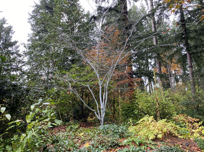 This garden, with its delicate perennials, could not survive without its protective canopy of trees. The largest are all native, with four species present: western red cedar (Thuja plicata), western hemlock (Tsuga heterophylla), Douglas fir (Pseudotsuga menziesii), and grand fir (Abies grandis). Below stand smaller deciduous and evergreen trees, mostly non-native, providing extra protection from the heat of the sun. These smaller trees are here on their own merits and provide attractive bark, fall foliage color, flowers, or ornamental fruits to enhance the Woodland Garden’s aesthetic appeal.